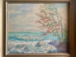 Wonderful oil on canvas board, signed lower left, depicting a tranquil lakeside scene, rendered with a gentle impressionistic touch. In the foreground, rocks softened by waves form a textured shoreline, their muted blues and greys contrasting with the bright, foamy crests of water rushing against them. The water itself glows in vibrant turquoise hues, catching light under a sky scattered with soft, dappled clouds. To the right, a slender tree leans into the scene, its branches adorned with a mix of green leaves and warm autumn tones of red and orange, suggesting the cusp of seasonal change. Lovely :)