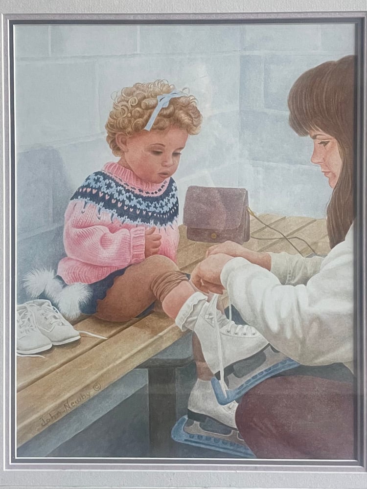 Watercolour composition on paper, signed John Newby lower left, depicting a tender moment between a mother and her young daughter in an ice-skating rink locker room. The mother, dressed in a white jacket, is carefully tying the laces of her daughter’s skates: Her concentration and gentle touch highlight a sense of care and warmth.