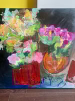 Vibrant oil floral on gallery canvas, signed Janet Young lower right, capturing an expressive still life of floral arrangements bursting with color and texture. The composition features two distinct vases—one a bright orange bowl, the other a deep red rectangular container—each overflowing with lively, loosely rendered blooms.