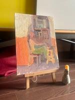 Oil study on canvas board, signed verso, unframed, depicting an intimate domestic scene rendered in a loose, impressionistic style. A seated figure occupies the foreground, their form simplified into soft strokes of pink, yellow, and green that blend with the surrounding space. The figure sits against a warm ochre wall, while a small stool in bright yellow adds a luminous accent. In the background, an arched doorway opens into another room where a table and chairs are faintly visible, painted in muted browns and grays that contrast with the warmth of the foreground. The brushwork is expressive and textured, with colors layered in broad strokes that emphasize atmosphere over detail. So tranquil and charming..