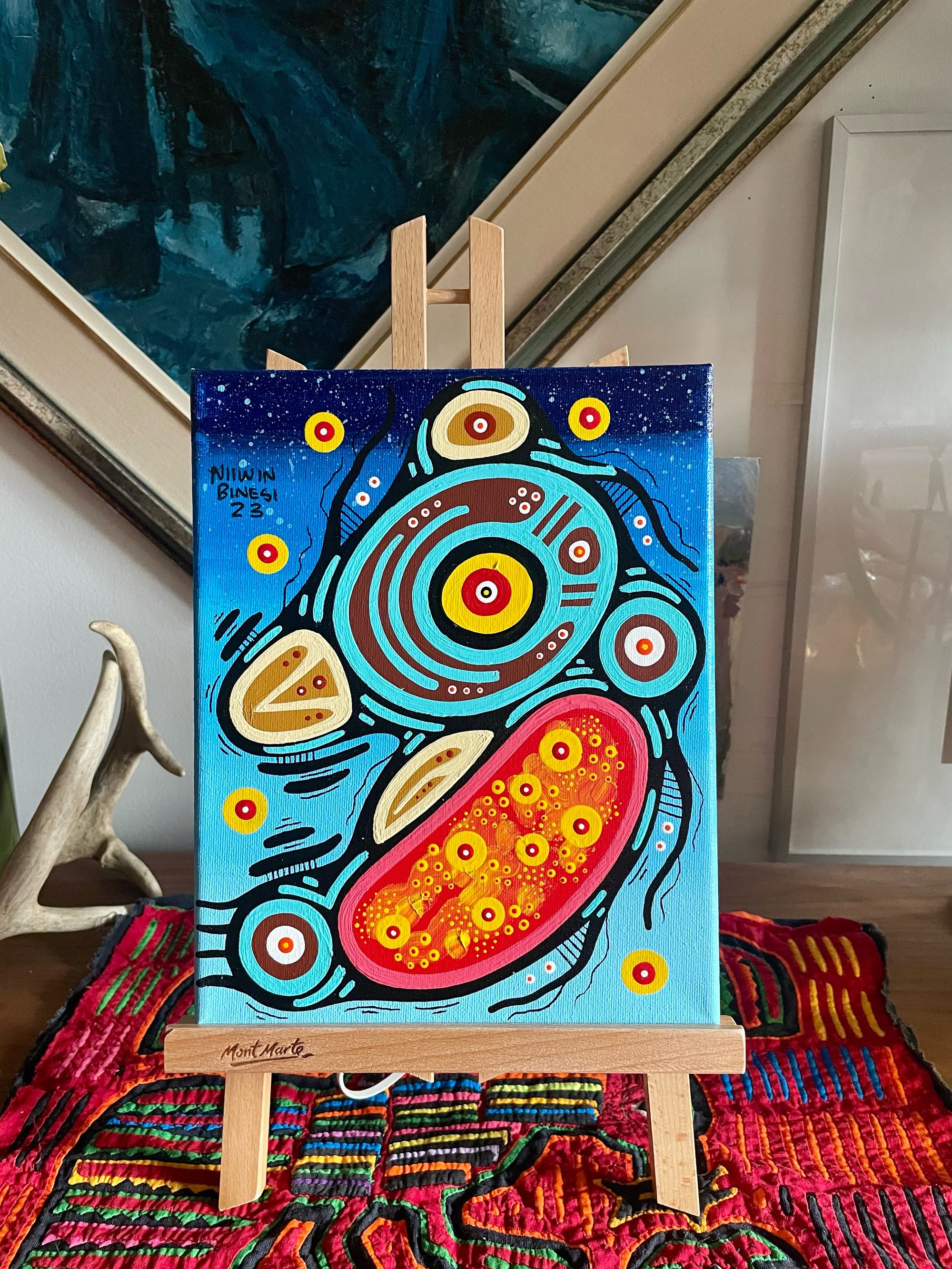 Vivid and spiritual composition on canvas by Toronto based artist Brent Hardisty titled “Medicine Bear”, signed and dated top left. A bear-like form emerges from a swirl of turquoise, red, and yellow, its body filled with concentric circles and energy dots—symbols often linked to healing, vision, and spirit. The blue background evokes a cosmic or dreamlike space, dotted with star-like orbs. Each element appears intentional, echoing themes of interconnectedness, medicine, and tradition.
