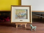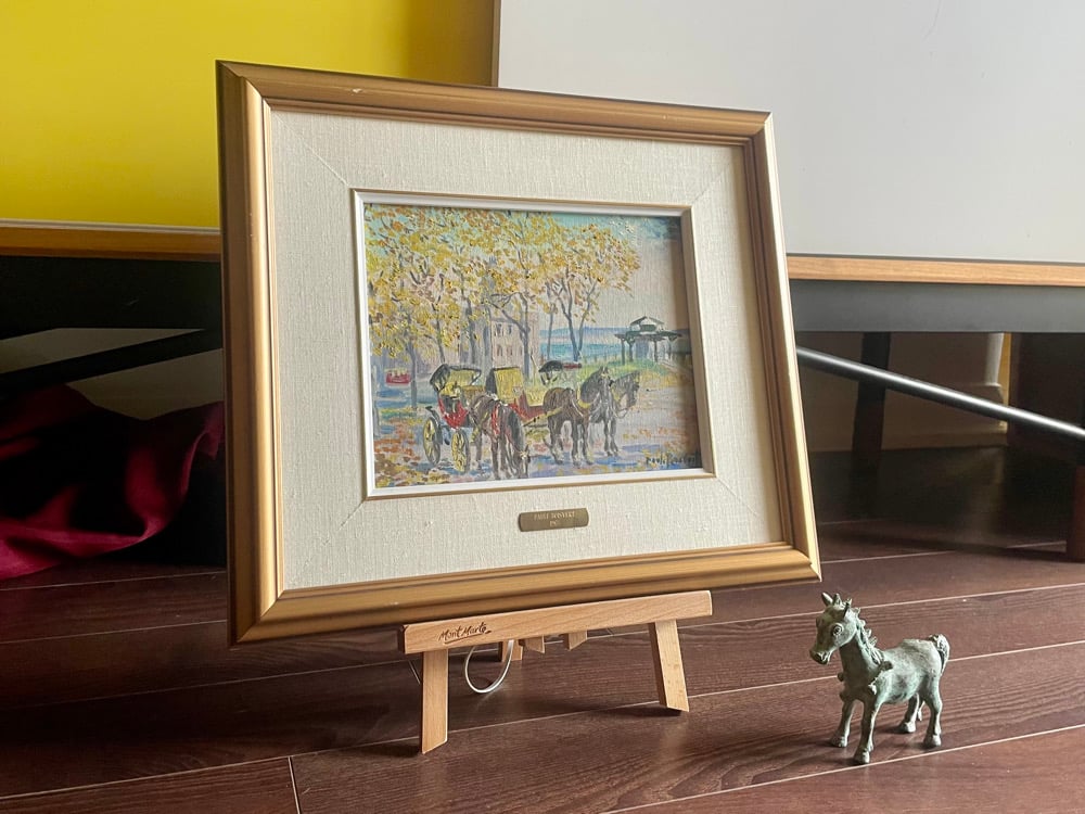 Charming oil on board, signed Paule Boisvert lower right, dated 1965 to the plaque beneath the image, capturing a nostalgic old Quebec scene rich in color and atmosphere. In the foreground, two elegant horse-drawn carriages—painted in vivid red and yellow—stand patiently under the dappled light of golden autumn foliage. The horses are rendered with expressive brushwork, their dark coats contrasting with the vibrant carriages they pull. A stately stone building rises between the trees, while to the right, a gazebo-like pavilion overlooks a serene body of water—perhaps the St. Lawrence River—shimmering under a soft, pastel sky.
