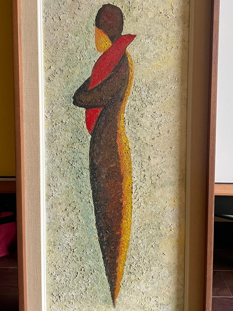 Minimalist oil figure painting on board, signed lower right, presenting a solitary human figure, tenderly embracing a smaller form cradled at her chest. Rendered in elongated, abstract shapes, the figure stands upright against a textured, neutral-toned background. The body is composed of deep browns and ochres, subtly contoured with warm yellow along one side, suggesting a sense of light or warmth. A bold red accent —possibly a child or symbolic bundle—nestled in the crook of the figure’s arm. Love the facelessness and fluid form! Quiet and contemplative, intimate and powerful..