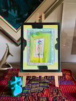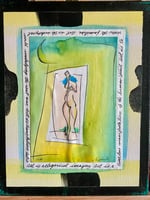 Vibrant mixed media drawing on canvas, signed and dated beneath the figure and also verso, is a conceptual and symbolic piece that blends figurative art, textual commentary, and layered abstraction. At the center of the work is a loosely rendered nude female figure, standing within a skewed rectangular frame, suggesting both containment and spotlight. The figure, with its simplified lines and delicate use of colour, carries a surreal and almost dreamlike aura.