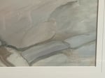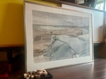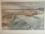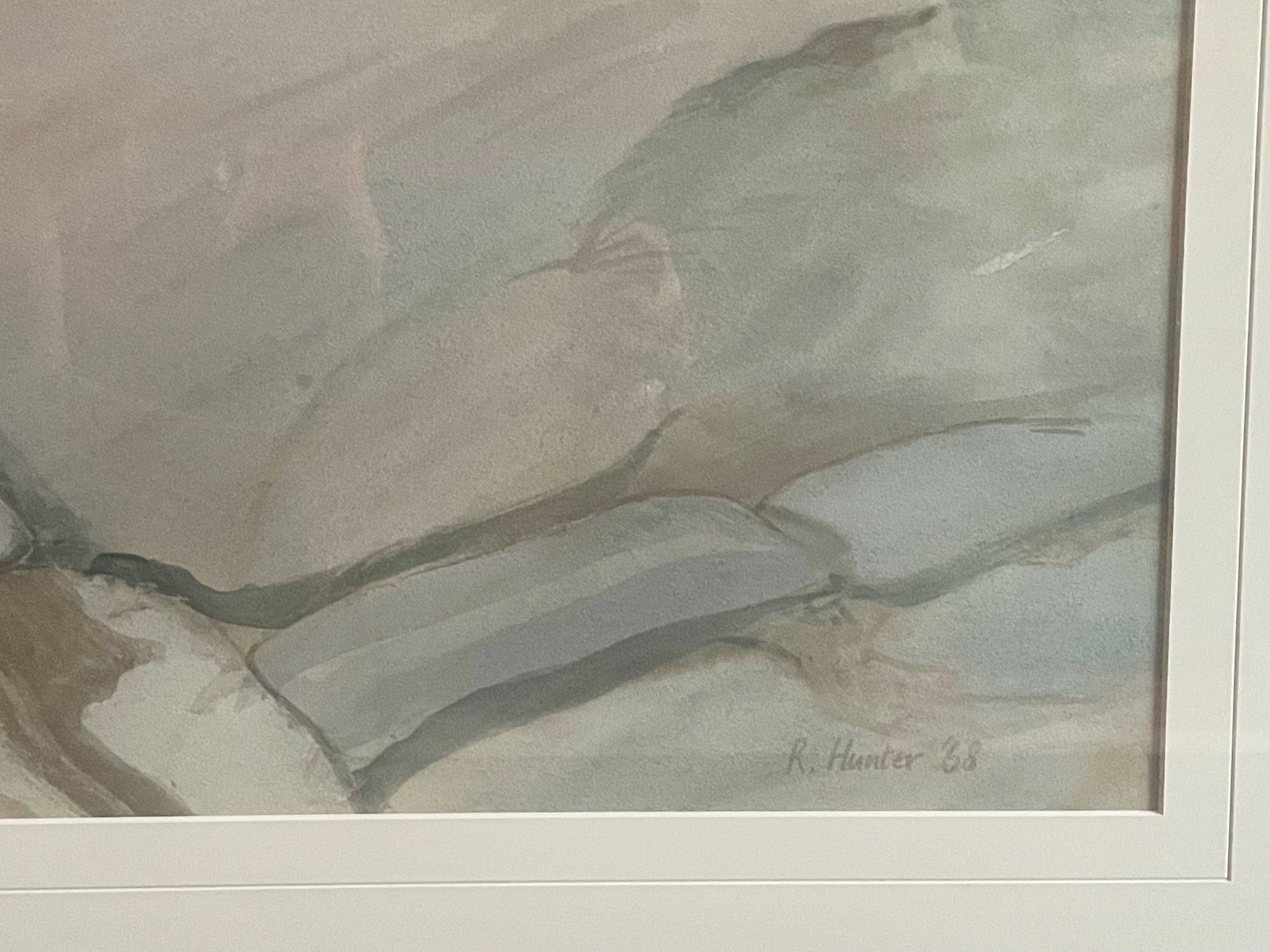 Large watercolour composition, signed R Hunter and dated 68 lower right, with artist label attached verso. This striking work captures a tranquil coastal landscape bathed in subdued evening light. The composition draws the viewer’s eye along a slipway, which curves gently across the scene towards the shoreline on the right. The muted color palette of soft browns, grays, and blues conveys a an almost melancholic atmosphere.