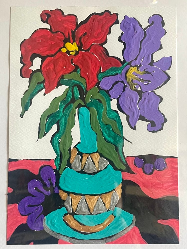 Floral acrylic composition on paper done by a Mexican artist, presenting a bold, vibrant still life with a strong graphic quality. At the center, a turquoise vase with decorative gold and silver geometric patterns holds two large, expressive flowers—one a deep, fiery red, the other a rich violet. Flowing green leaves cascade downward, their curved forms contrasting with the rigid shapes on the vase. The background is composed of sweeping fields of magenta, black, and purple, creating a lively, almost theatrical stage for the floral arrangement. Celebratory and rhythmic!