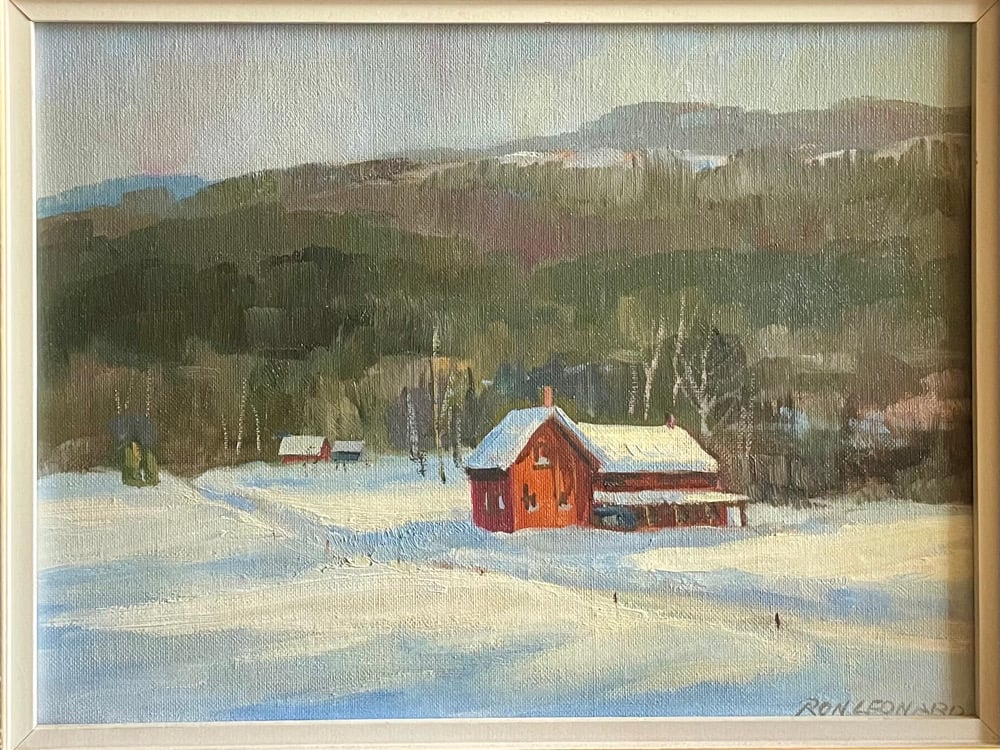 Oil wintry scene on board, signed “Ron Leonard” lower right, dated 83 verso, capturing the quiet stillness of a winter countryside. At the center of the composition stands a striking red farmhouse with a snow-covered roof, its warm color glowing against the cool whites and blues of the snowy field. A few smaller outbuildings are scattered in the distance, partially blending into the surrounding forest of dark evergreens and bare trees. The rolling hills rise gently in the background, their muted greens and browns softened by a hazy winter light. Broad, confident brushstrokes depict snow’s reflective surface, layering shades of blue, lavender, and white. The red farmhouse becomes the focal point, a beacon of warmth and life within the serene, expansive landscape. So peaceful..
